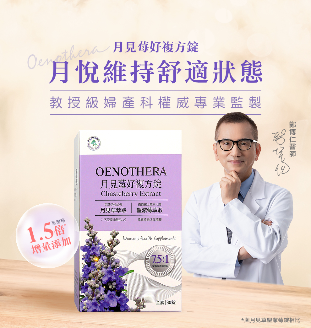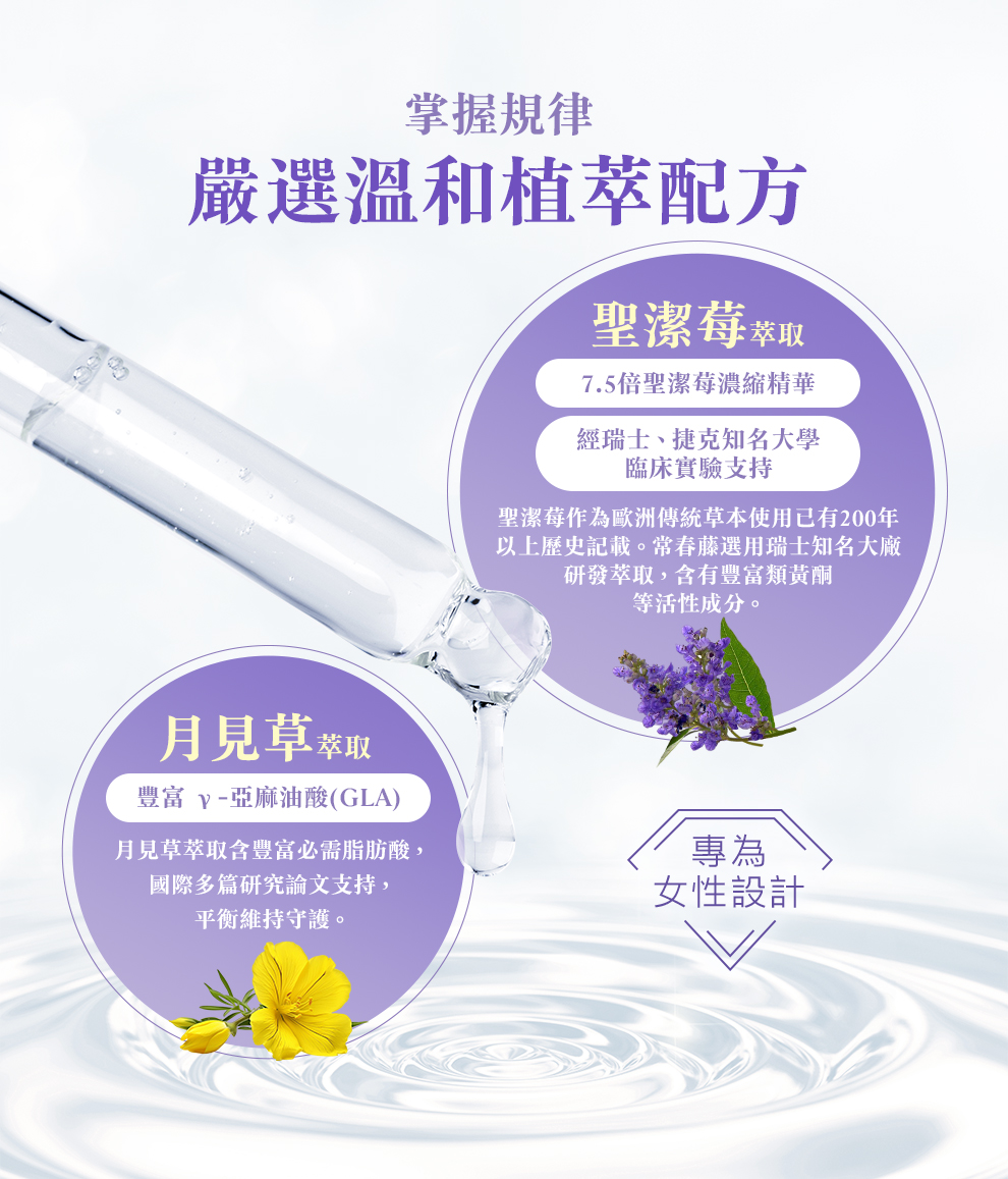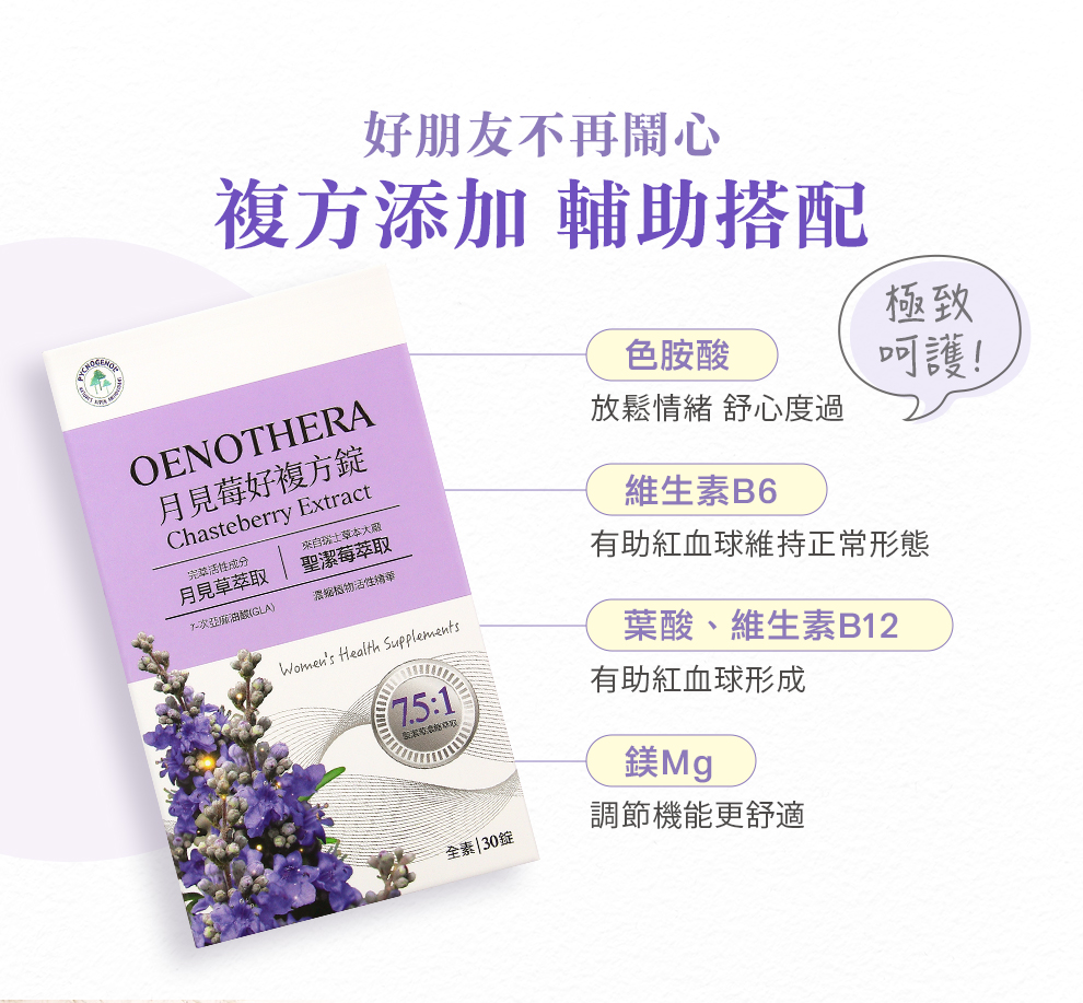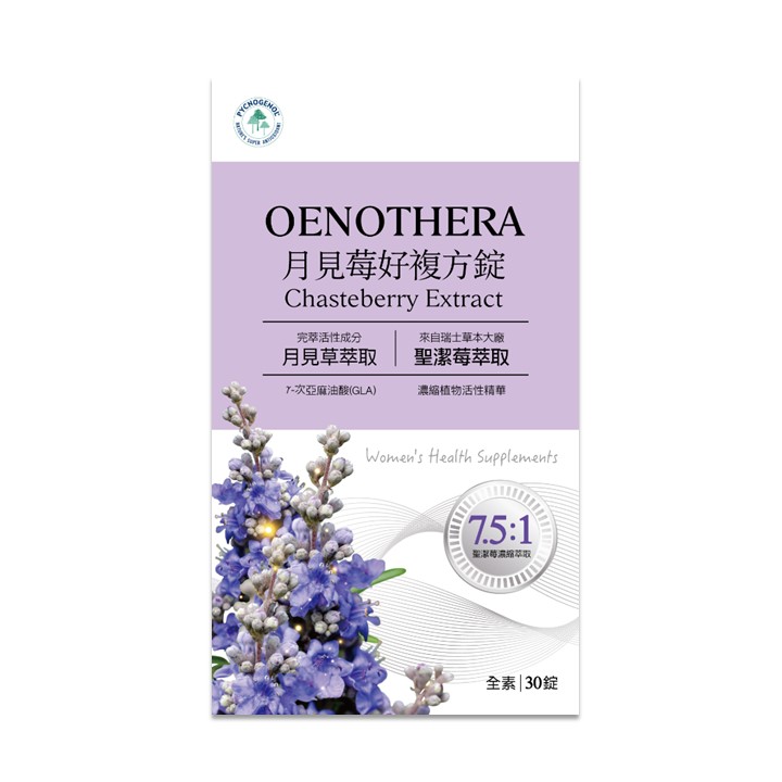 舒適狀態 月悅更順心~ 月見莓好複方錠 .月見草萃取 > 完整萃取活性成分 γ-次亞麻油酸 .聖潔莓萃取 > 增量1.5倍*! 瑞士大廠聖潔莓濃縮精華 .松樹皮萃取 > 超過400篇國際實證,具GRAS安全認證 *與月見草聖潔莓錠相比