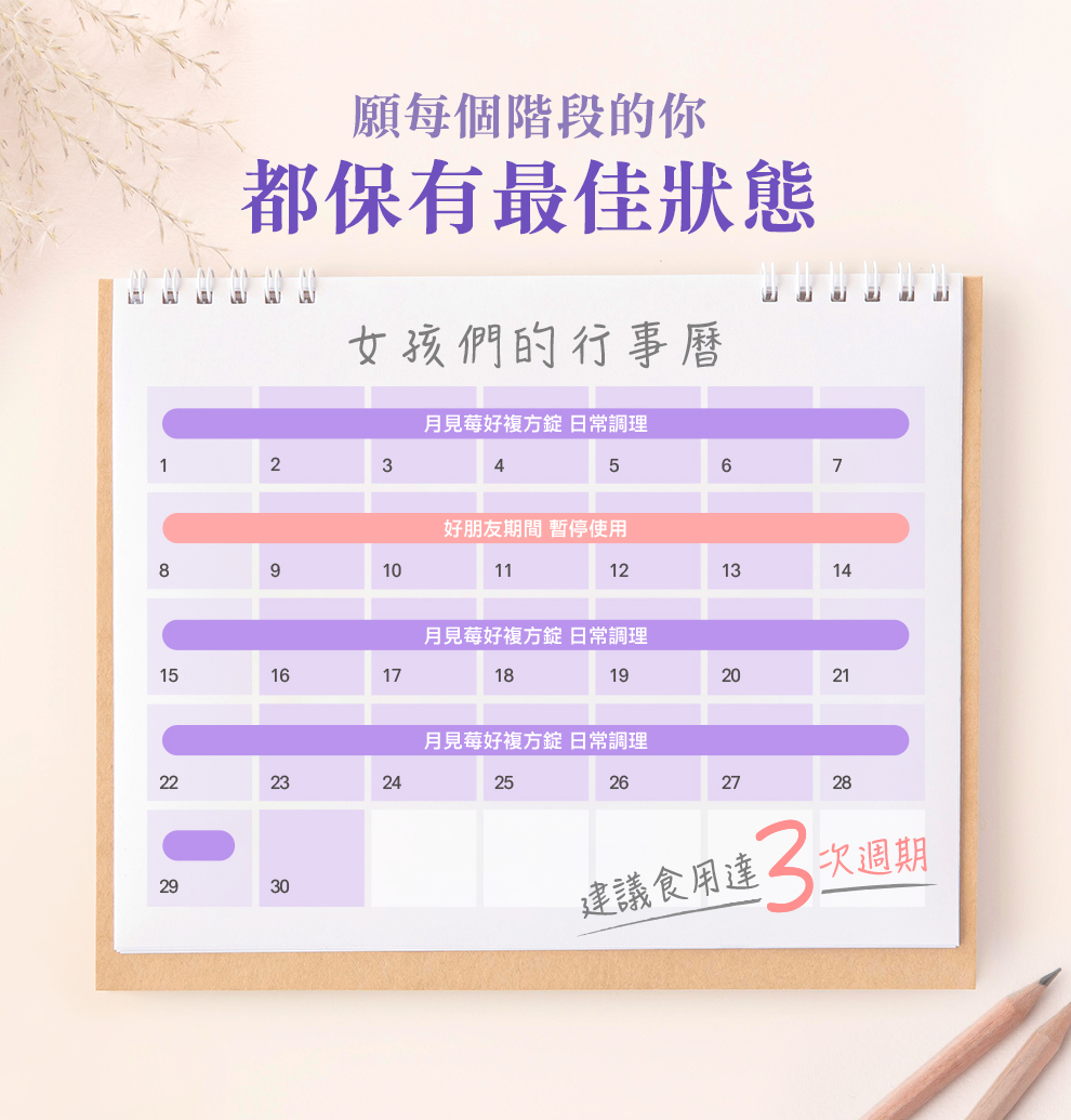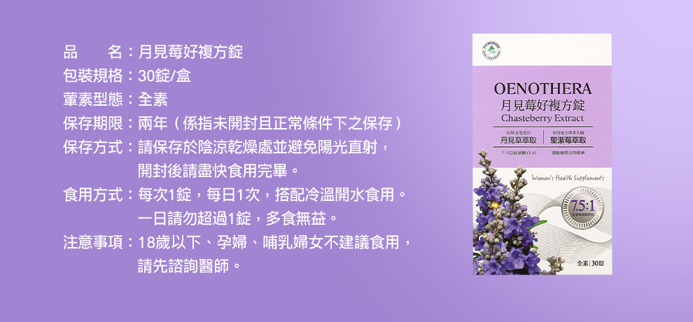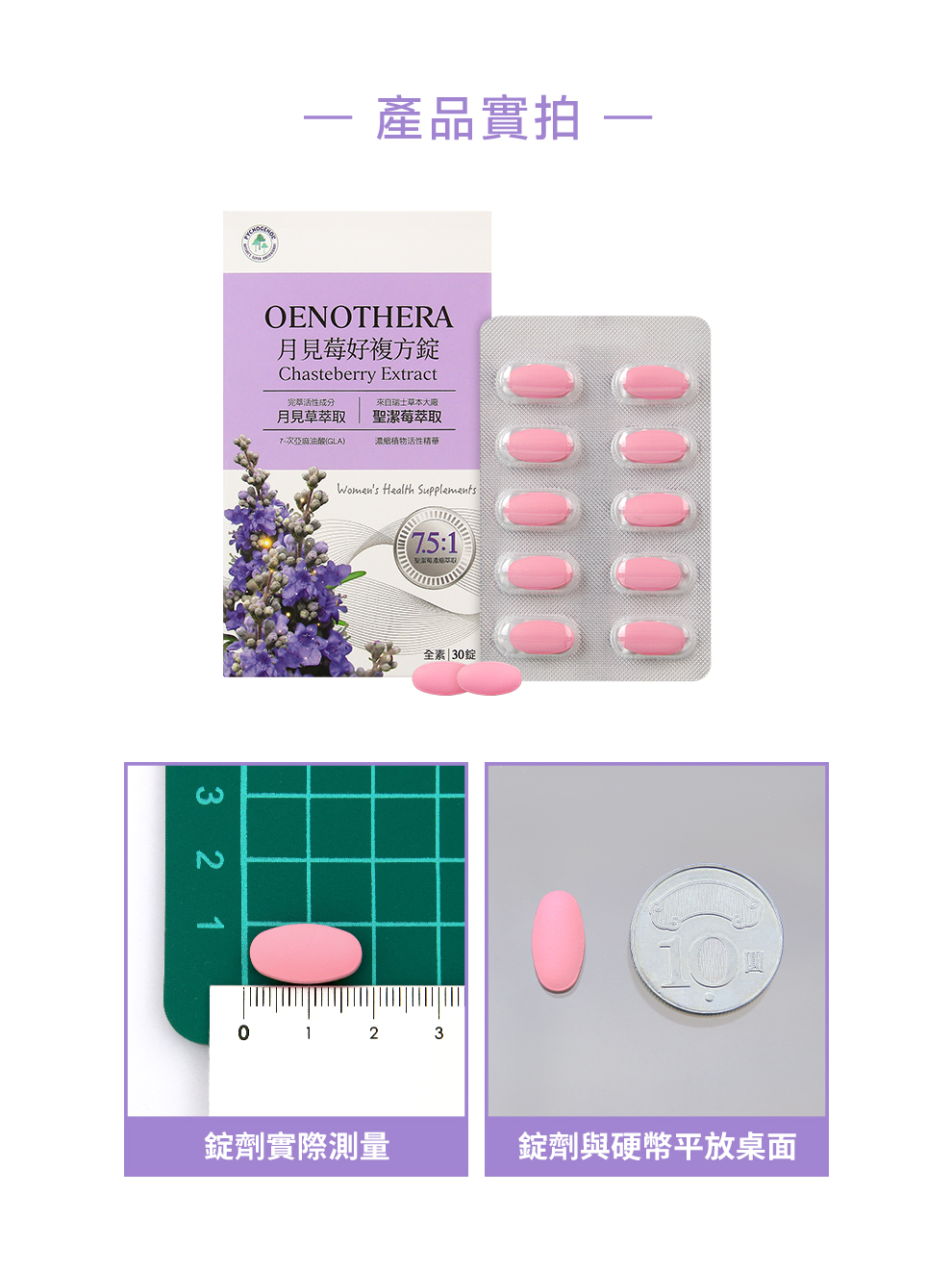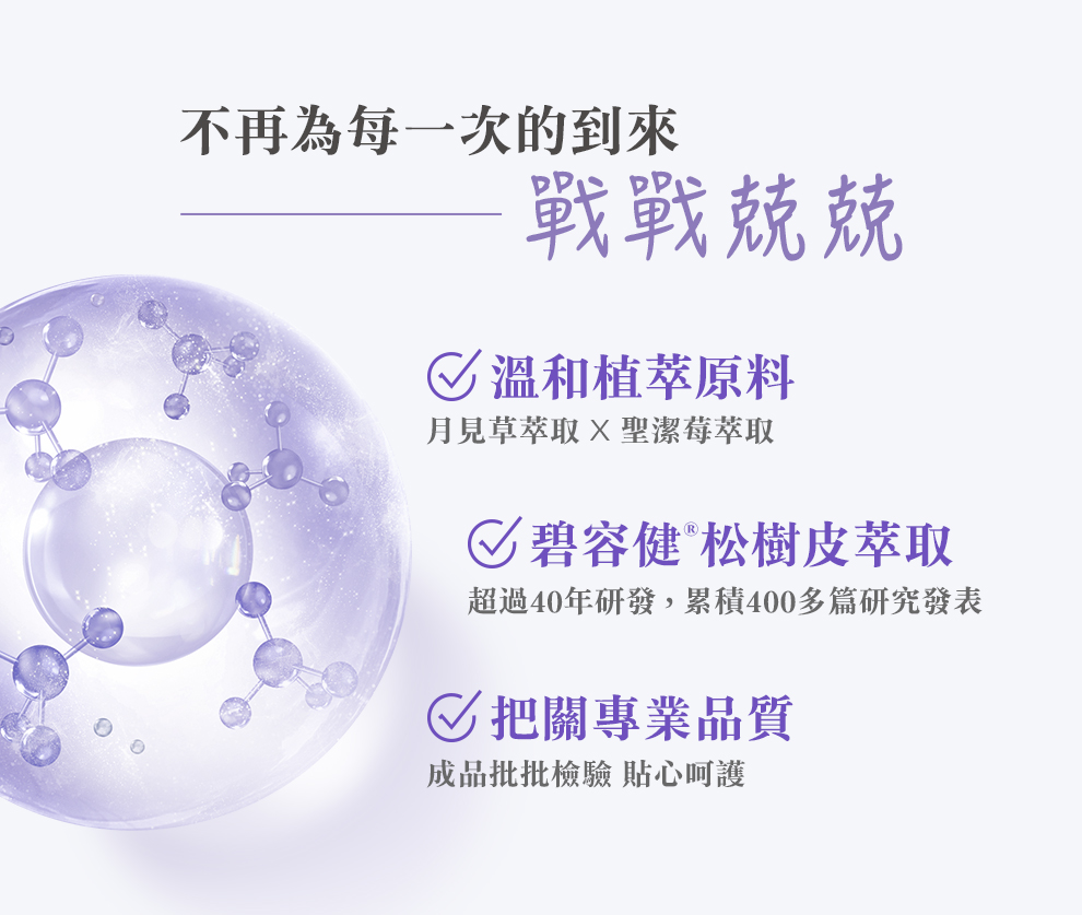 舒適狀態 月悅更順心~ 月見莓好複方錠 .月見草萃取 > 完整萃取活性成分 γ-次亞麻油酸 .聖潔莓萃取 > 增量1.5倍*! 瑞士大廠聖潔莓濃縮精華 .松樹皮萃取 > 超過400篇國際實證,具GRAS安全認證 *與月見草聖潔莓錠相比