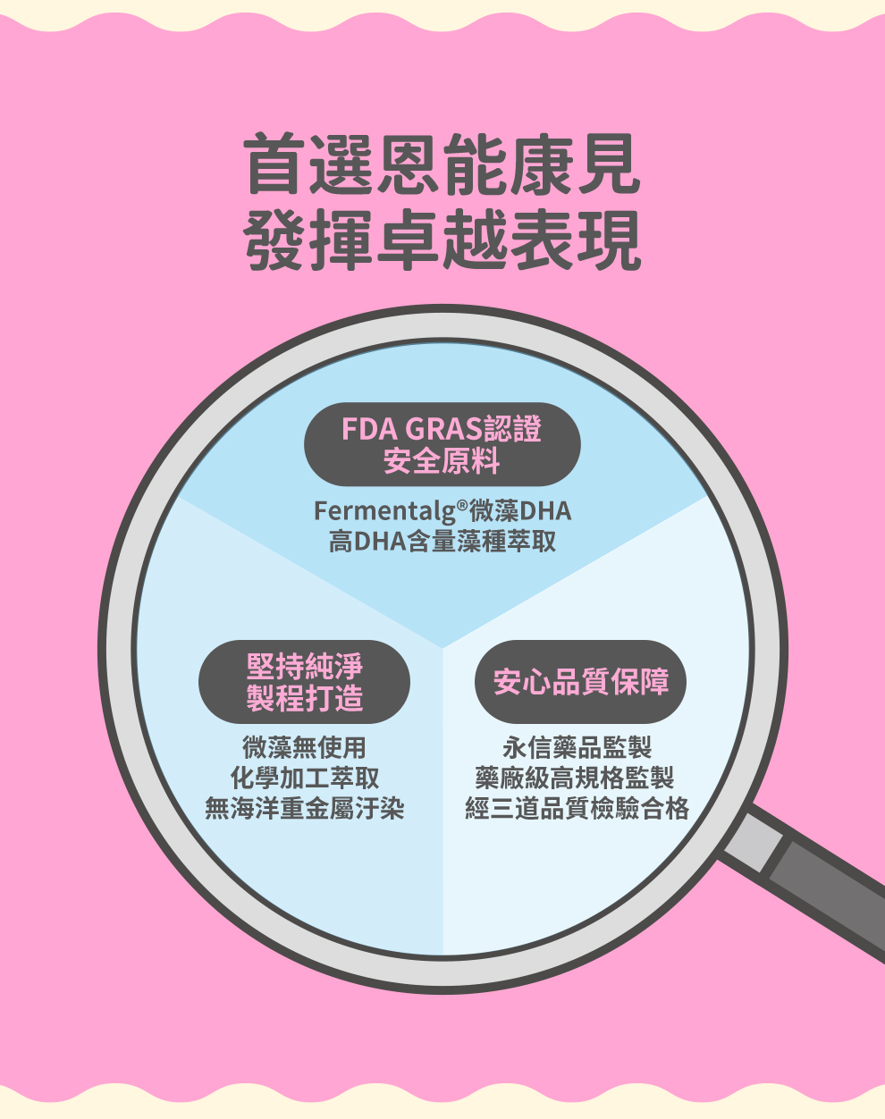 .法國微藻 > 取自紅樹林中裂壺藻種,以無菌密閉培養 .純淨製程 > 全製程無化學酯化加工萃取之DHA .永信監製 > 全台第一PIC/S認證藥廠-永信高規格監製 .牛奶風味 > 升級牛奶風味 配方好吃更單純!